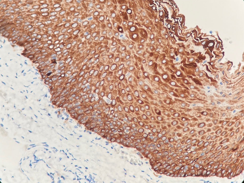 Les cytokératines HMW incluent principalement les sous-types CK1, CK5, CK10 et CK14. Elles sont spécifiquement exprimées dans l’épithélium squameux, les cellules basales et les cellules myoépithéliales, mais pas dans l’épithélium simple (hépatocytes, acini pancréatiques, tubules proximaux rénaux), ni dans les tissus nerveux, mésenchymateux (ex. vaisseaux sanguins) ou les tumeurs non épithéliales telles que les lymphomes et mélanomes.