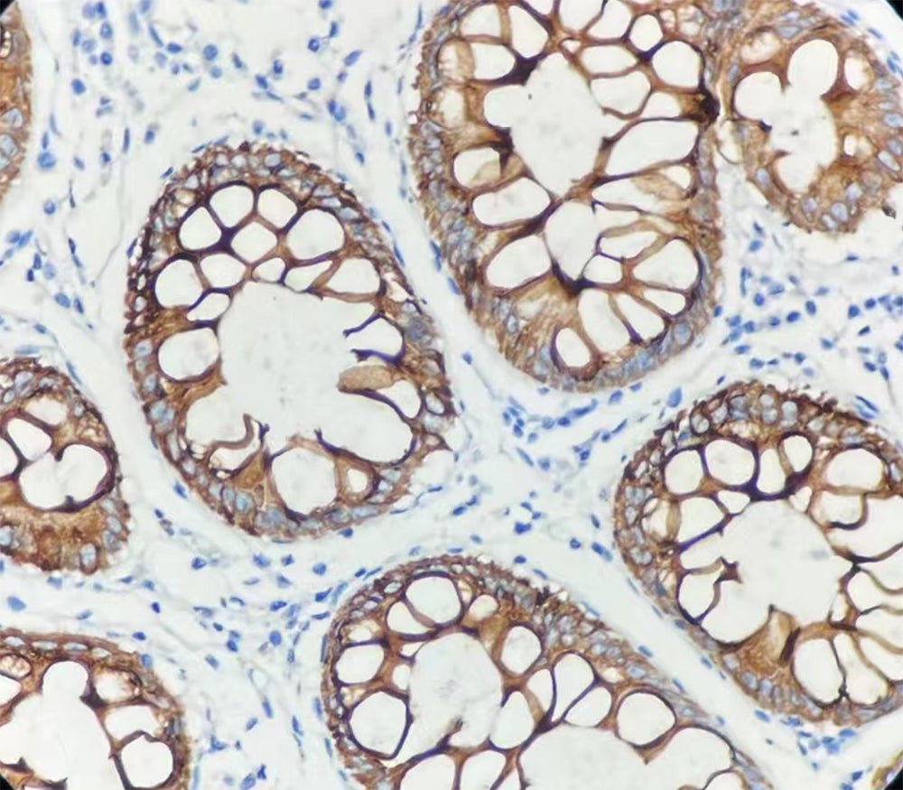 CK20 est une kératine de type I, spécifiquement exprimée dans l’épithélium gastro-intestinal, l’urothélium et les cellules de Merkel. Elle sert de marqueur des entérocytes matures et des cellules caliciformes de la muqueuse gastrique et intestinale.