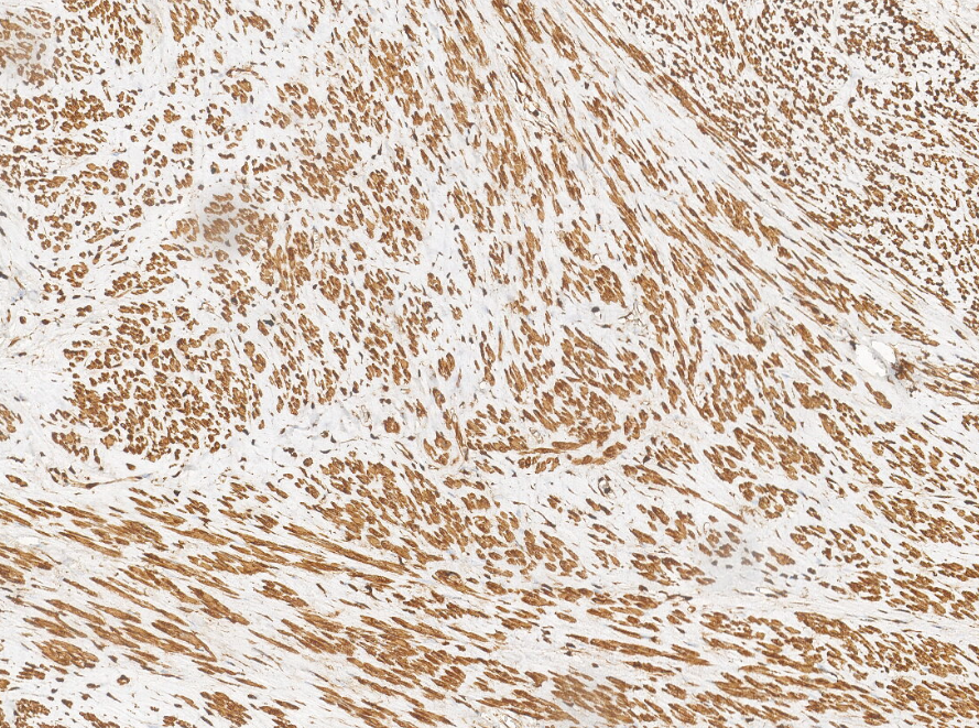 L’anticorps réagit avec les léiomyomes, rhabdomyomes et cellules périvasculaires de tumeurs glomiques cutanées (si d’origine myogénique), confirmant la composante/différenciation myogénique des tumeurs.