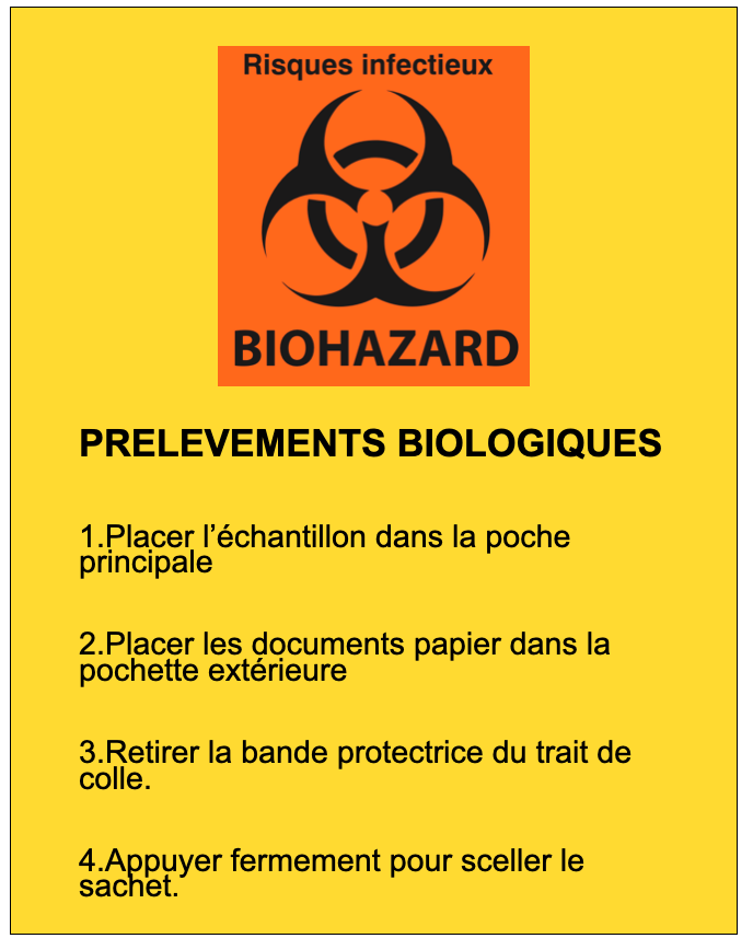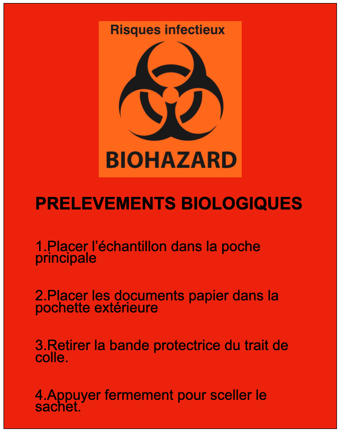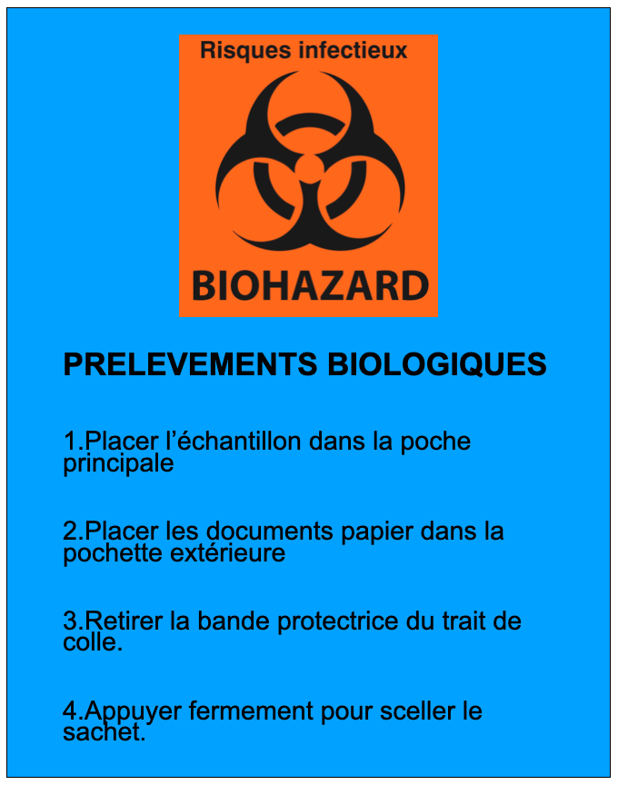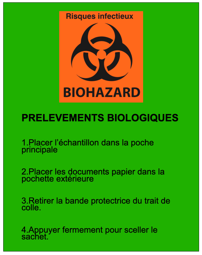 Logo biohazard et mode d’emploi imprimés sur la poche avant